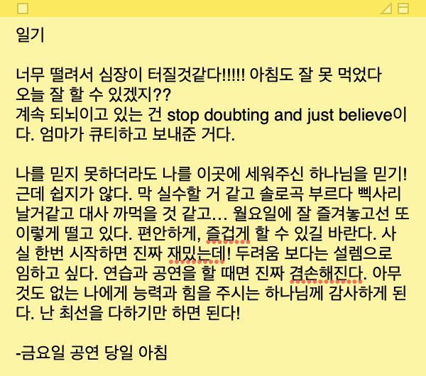 Even if I can’t fully trust myself, I can trust God, who placed me here! But it’s not easy. I keep thinking I’ll make mistakes, mess up my solo song, or forget my lines… I had so much fun on Monday’s Invited Dress, and yet here I am, nervous again. I hope I can do this comfortably and joyfully. Honestly, once I get started, I know it’s going to be so fun! I want to face this with excitement rather than fear. Every time I rehearse or perform, I become truly humbled. It makes me so grateful to God, who gives strength and ability to someone like me who has nothing on her own.